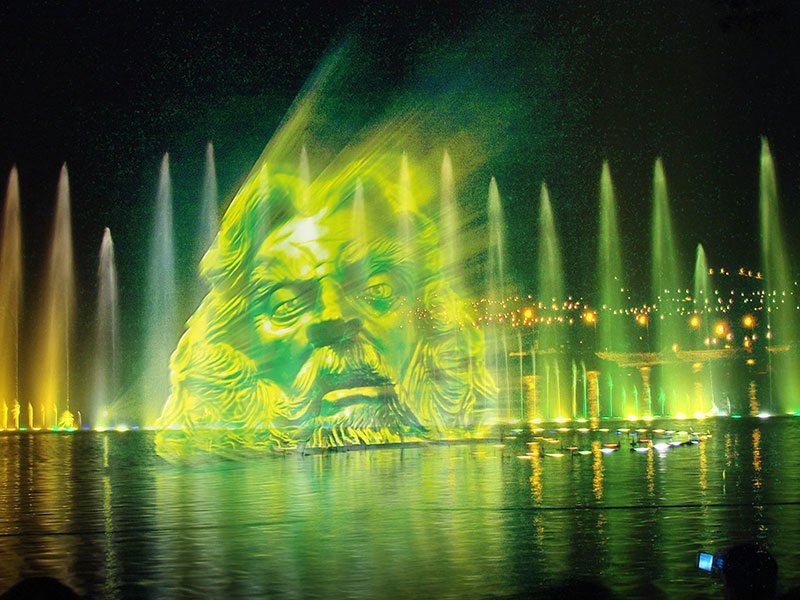 Water curtain laser激光,光色純正,能量集中。利用現代高科技光學振鏡技術,在水幕噴頭噴出的水幕上形成色彩鮮艷、表...